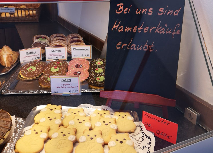Die Idee dazu hatte Geselle Erik Urwank. „Er meinte, jetzt, wo alle hamstern, können die Kunden bei uns ganz ohne schlechtes Gewissen Hamster mit nach Hause nehmen“, verriet Thomas Nitschke dem Online-Portal Tag24 News Deutschland. Mit einem Augenzwinkern fügte er hinzu: „Die Abgabe ist nicht auf ein Stück pro Kunde beschränkt. Wer mehr will, kann mehr kaufen.“ Eigentlich schade, dass die Feinbäckerei Nitschke nur ein Geschäft hat, wo die Kunden hamstern können.