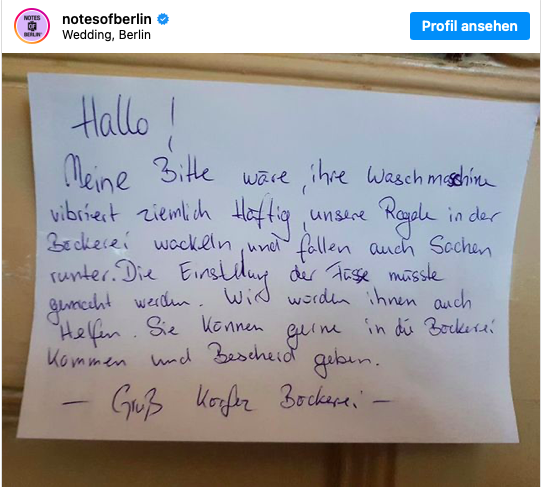 Das Teilen von gefundenen Zetteln ist in den sozialen Medien derzeit beliebt. Der Instagram-Account „notesofberlin“ postet regelmäßig in der Hauptstadt gefundene Exemplare. Oft sind es ärgerliche Kommentare, die die Mitmenschen auf ein Versäumnis oder einen Fehler aufmerksam machen wollen. Die Bäckerei Körfez in Berlin schrieb auch einen Zettel, aber so freundlich und hilfsbereit, dass es die Community begeisterte: “Ihre Waschmaschine vibriert ziemlich heftig”, heißt es da und wendet sich an die Nachbarn oben drüber. “Unsere Regale in der Bäckerei wackeln und es fallen Sachen runter.” Von Ärger keine Spur, vielmehr bietet die Bäckerei sogar Hilfe, beim Einstellen der Waschmaschinenfüße an, um das Wackeln der Maschine im Schleudergang zu verhindern.
